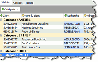 Les onglets «Visibles», «Cachées» et «Toutes» permettent de regrouper l'affichage des informations selon qu'on a demandé de les cacher ou non dans les résultats de recherche. Pour que les informations d'un dossier maître se retrouve sous l'onglet «Cachées» il suffit de cocher sa case «Cacher cette fiche dans les fenêtres de recherche» dans le dossier approprié. Cette fonctionnalité est disponible dans les dossiers des «Clients», «Produits et services», «Groupes de produits», «Sous-groupes de produits», «Employés», «Fournisseurs», et la «Charte des comptes de grand livre». Par exemple, on pourrait vouloir dissuader les utilisateurs de sélectionner certaines fiches. Les fiches cachées existent toujours, donc l'utilisateur pourrait décider de saisir manuellement son code dans le champ désiré ou de la sélectionner sous l'onglet «Cachées» ou «Toutes» car ce dernier affiche les fiches cachées et non cachées. L'onglet «Visibles» est sélectionné par défaut à l'ouverture de la fenêtre des résultats de recherche.