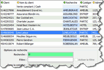 Le système de recherche permet de rechercher rapidement un dossier maître (Clients/Produits et services/Catégories, etc.). Il est aussi possible d'effectuer des tris et des regroupements de données, d'appliquer des conditions de filtres sur une ou toutes les colonnes en plus de permettre des recherches sur toutes les colonnes visibles.