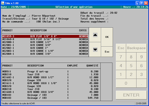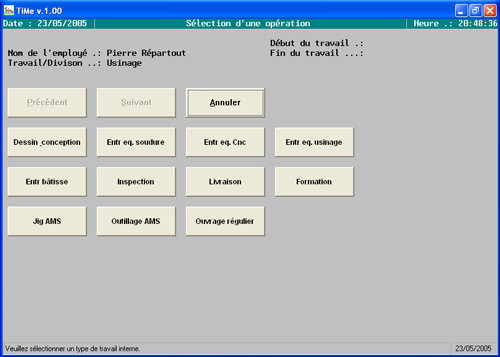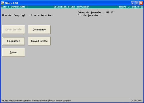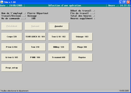 Un sous-menu permet de préciser l'opération à effectuer. Après avoir appuyé sur le bouton, le système débute le calcul du temps travaillé sur la commande. Lorsque l'opération est terminée, l'employé doit accéder à TiMe, inscrire son code d'employé et le numéro de la commande pour ensuite appuyer sur le bouton Fin commande.