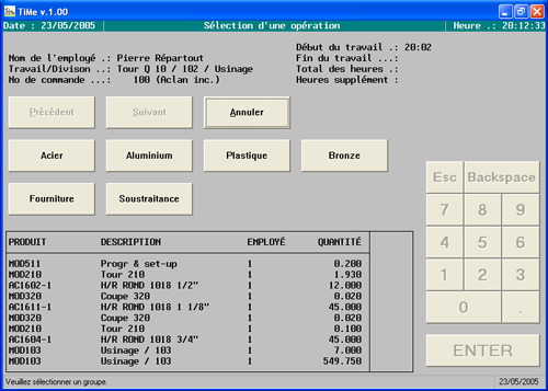 - Début activité: Permet de débuter le calcul du temps de travail de l'employé sur un opération de main-d'oeuvre indirecte. Ce temps n'est pas affecté à une commande client (bon de travail). Il est cumulé et présenté dans les rapports de TiMe.