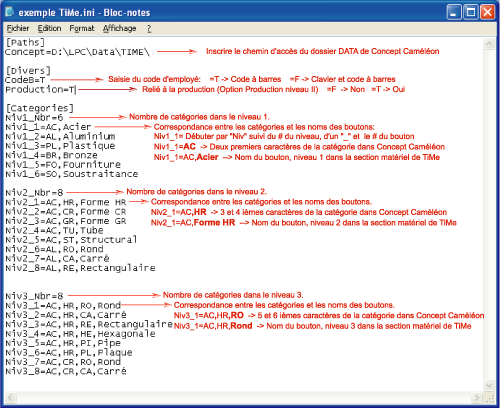 Cette partie contient les trois niveaux maximum de recherche pour les produits (matériel). Au début de chaque ligne des niveaux, il est obligatoire d'inscrire le nombre total de catégories qui sont définies dans le fichier «ini», exemple: «Niv1_Nbr=6» soit 6 catégories (6 boutons dans TiMe). Voir l'exemple ci-haut pour plus de détails. Il n'est pas nécessaire de créer les trois niveaux, un seul niveau est nécessaire au fonctionnement de TiMe.