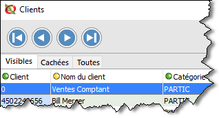 Les onglets «Visibles», «Cachées» et «Toutes» permettent de regrouper l'affichage des informations selon qu'on a demandé de les cacher ou non dans les résultats de recherche. Pour que les informations d'un dossier maître se retrouve sous l'onglet «Cachées» il suffit de cocher sa case «Cacher cette fiche dans les fenêtres de recherche» dans le dossier approprié. Cette fonctionnalité est disponible dans les dossiers des «Clients», «Produits et services», «Groupes de produits», «Sous-groupes de produits», «Employés», «Fournisseurs», et la «Charte des comptes de grand livre». Par exemple, on pourrait vouloir dissuader les utilisateurs de sélectionner certaines fiches. Les fiches cachées existent toujours, donc l'utilisateur pourrait décider de saisir manuellement son code dans le champ désiré ou de la sélectionner sous l'onglet «Cachées» ou «Toutes» car ce dernier affiche les fiches cachées et non cachées. L'onglet «Visibles» est sélectionné par défaut à l'ouverture de la fenêtre des résultats de recherche.
