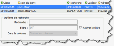 Exemple de la fenêtre de recherche utilisée pour trouver un client dans les dossiers clients :