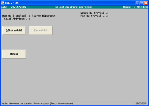 - Début activité: Permet de débuter le calcul du temps de travail de l'employé sur un opération de main-d'oeuvre indirecte. Ce temps n'est pas affecté à une commande client (bon de travail). Il est cumulé et présenté dans les rapports de TiMe.