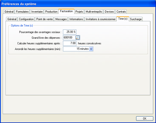 Pour modifier les préférences de TiMe dans Concept Caméléon, cliquez sur «Utilitaires->Configuration->Préférences du système». Sous l'onglet «Facturation», cliquez sur l'onglet «TiMe».