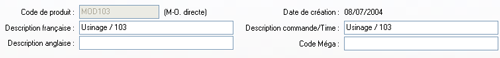 Le champ «Description commande/TiMe» est utilisé pour la description des boutons de main-d'ouvre dans TiMe. Un produit de type opération apparaît dans TiMe seulement si la catégorie est «Divis1» ou «Divis2»