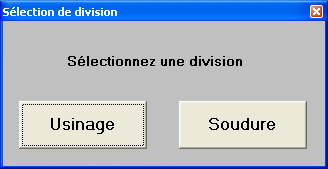 Après avoir inscrit le code d'employé et le numéro de commande sur laquelle les travaux doivent être effectués, l'écran «Sélection de division» apparaît, vous donnant le choix entre deux divisions. Ici, par exemple, vous avez les boutons «Usinage» et «Soudure». Pour changer la description de ces boutons, vous devez le faire dans les catégories «DIVIS1» et «DIVIS2» de Concept Caméléon.